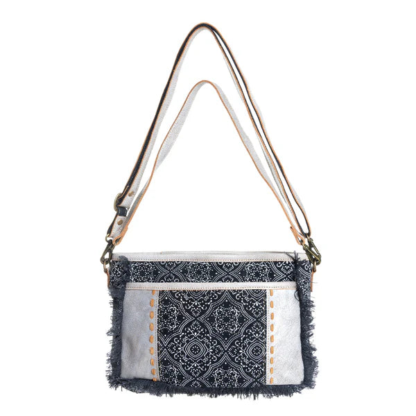 This dynamic bag will make a great fashion statement as you embrace eco-chic style. Adorned with an intricate black and white pattern, this versatile accessory features premium leather accents, artisanal accent stitching and frayed edge accents. The adjustable shoulder strap in matching leather offers comfort, while multiple pockets ensure organization. Zipper-close top. Elevate your look sustainably with this unique, handcrafted treasure.