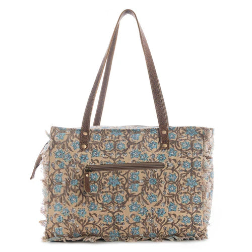 Hues of blue, brown and ivory lend gentle gracefulness to the blossoms of this beautiful bag. The interior is roomy, ready to carry your essentials. Frayed edge treatments finish out the design with a flourish. The back has an extra zippered pocket for convenience. Durable carrying handles are in matching leather. A magnificent bag that you'll love!