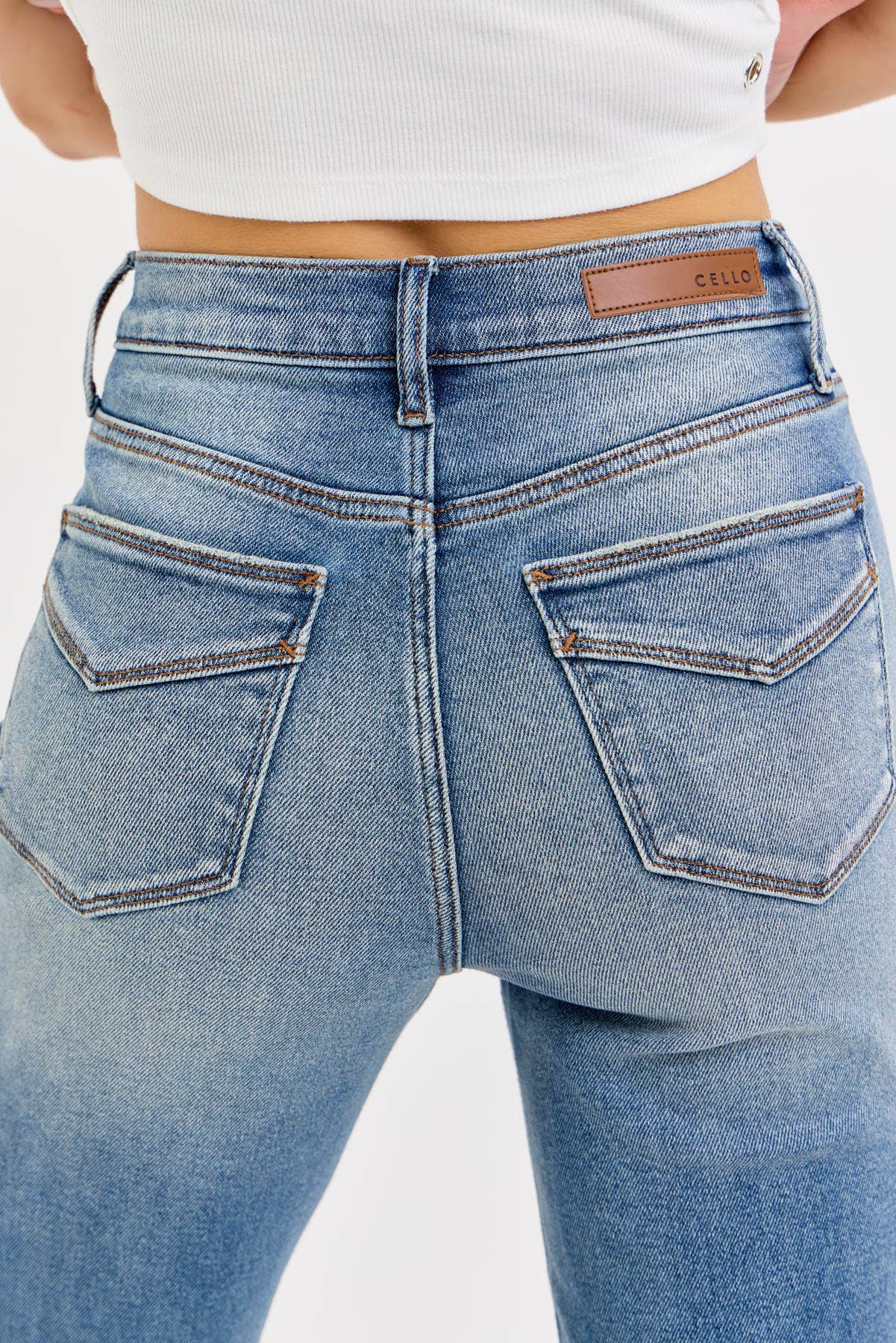 High Rise Crop Straight Belt Loops Zipper Tinted Wash Front Rise 11 1/2", Inseam 28" (Cuffed) Fabric Content: 94% Cotton, 4% Polyester, 2% Spandex
