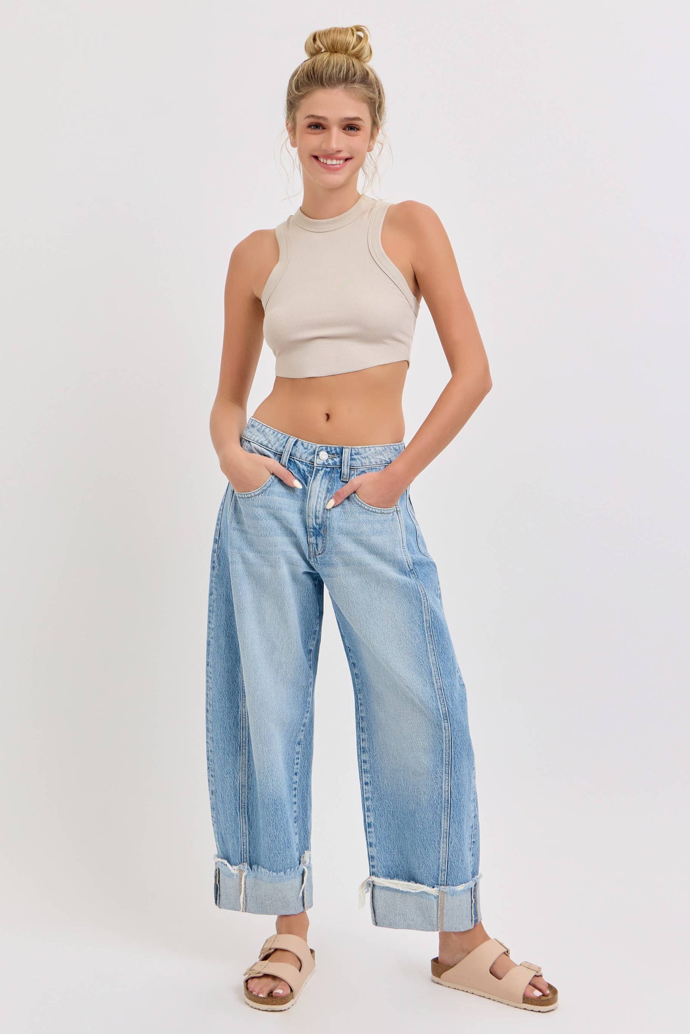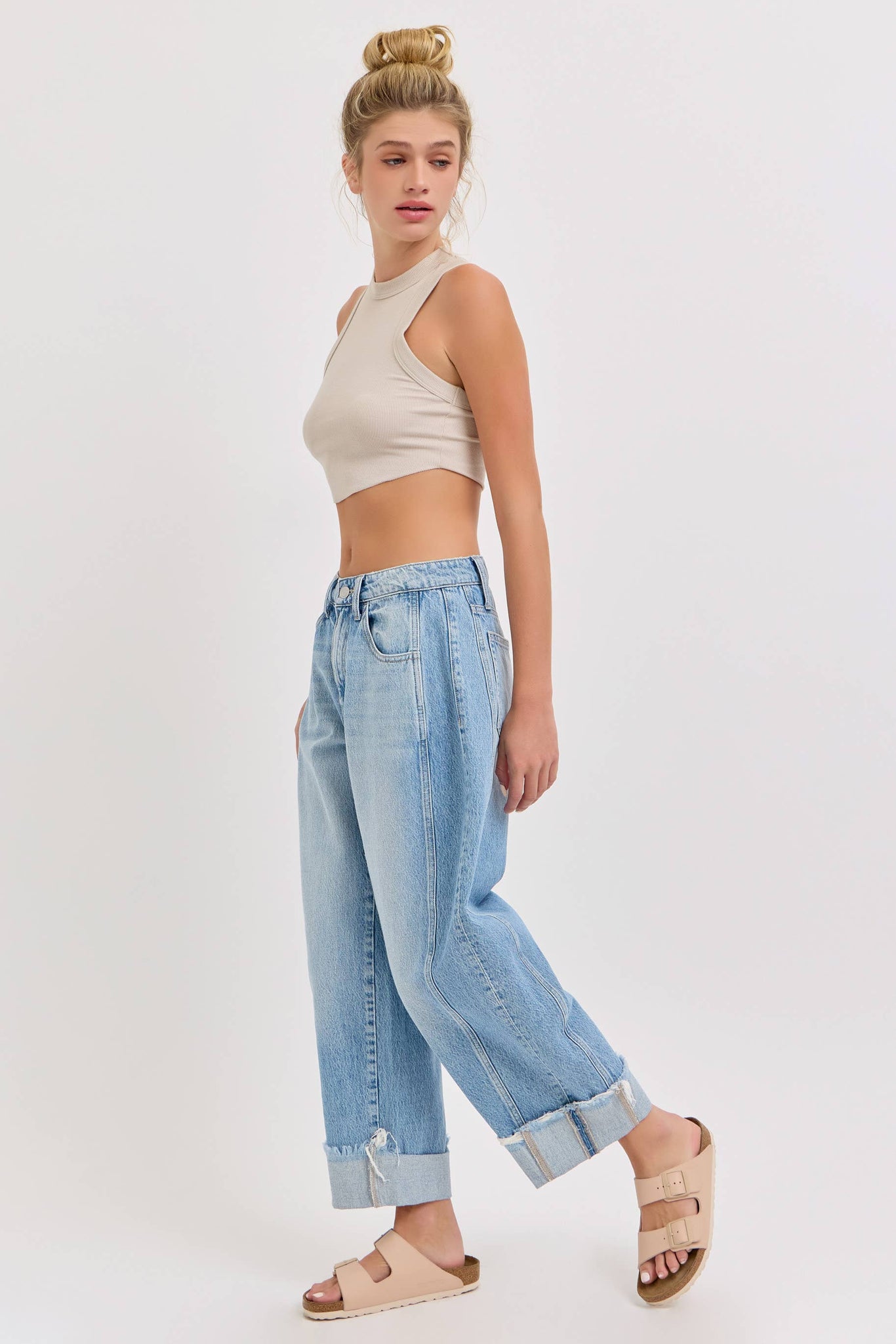 Mid Waisted Barrel Leg with Cuff Side Panels Belt loops + Zip fly Light Denim Import Front Rise: 11 3/4" Inseam 27" Fabric Content:100% Cotton