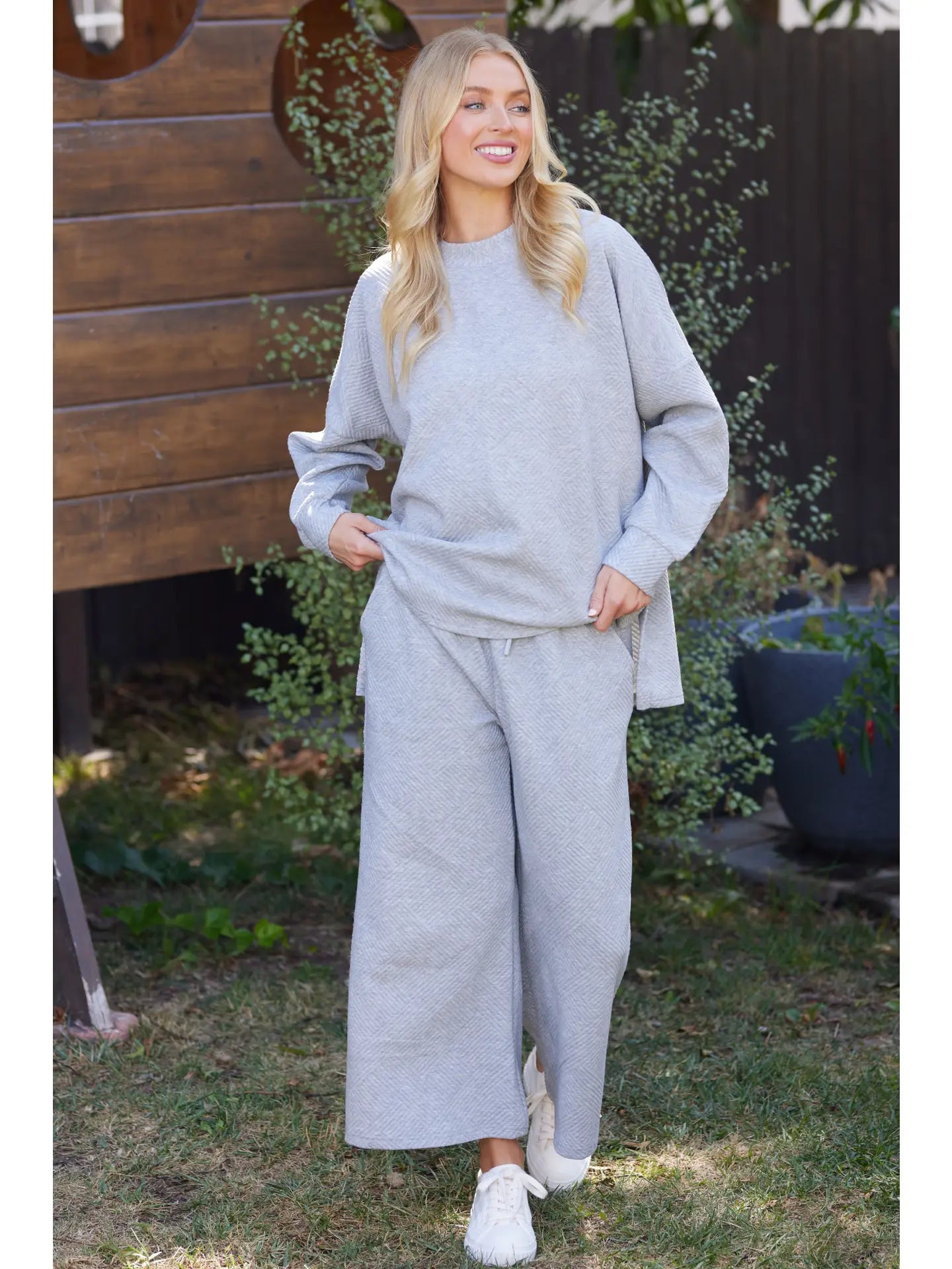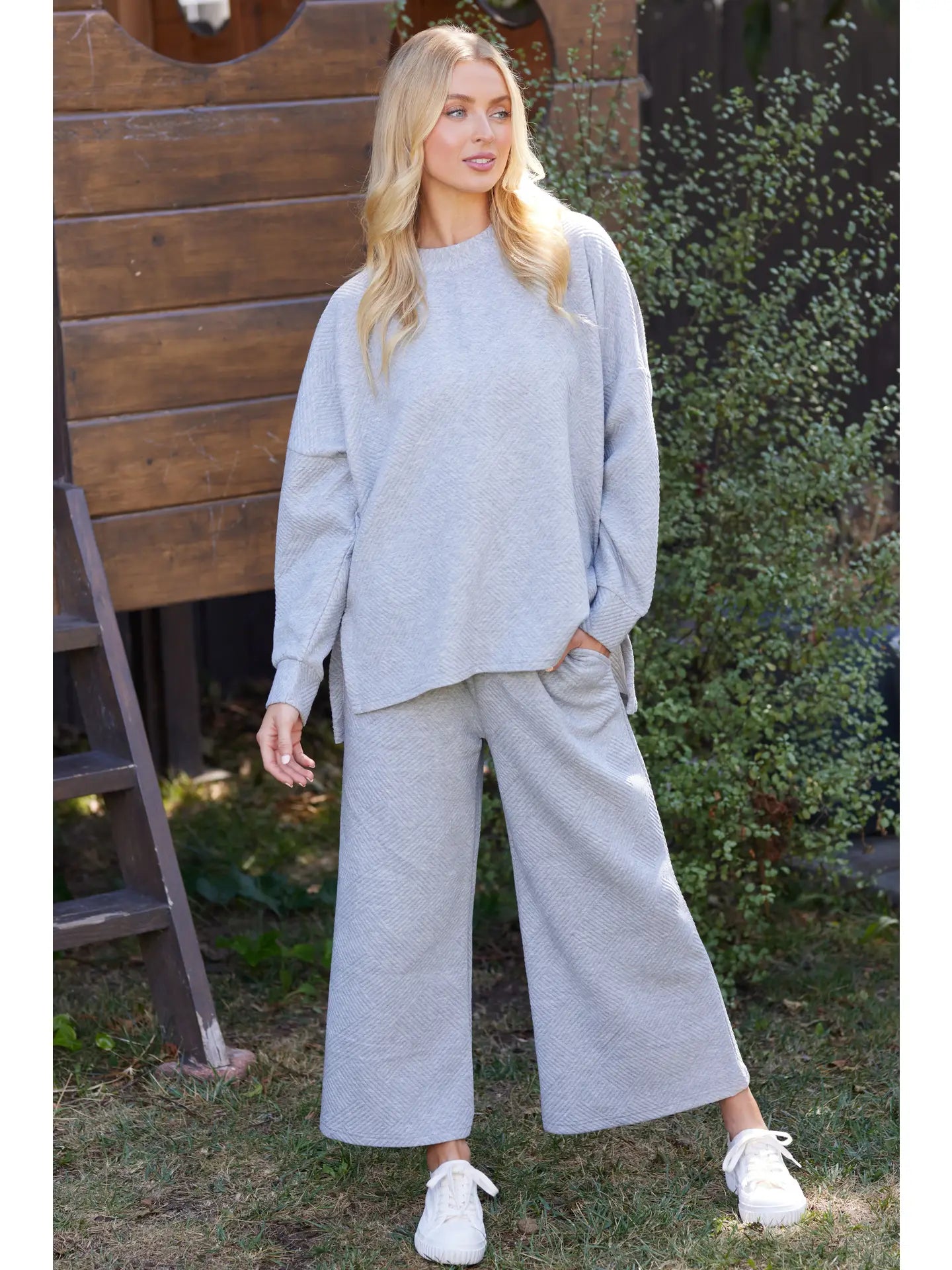 Solid textured matching top and pants. The top featured mock neck,