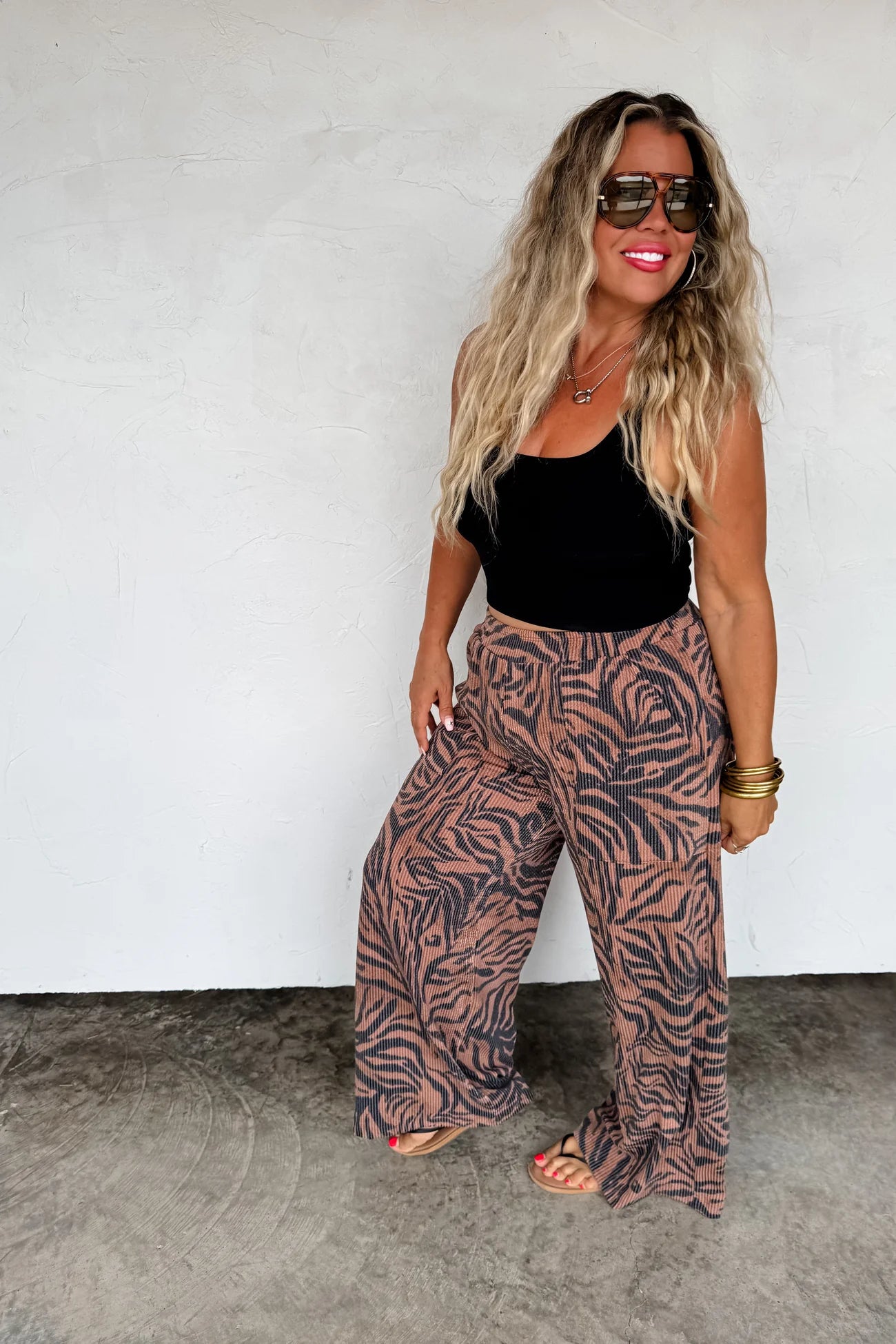 Soft, cozy and so so stretchy! These zebra print ribbed pants are the perfect way to add a "pop" to any outfit!! Features oversized panel pockets, wide legs and elastic waist with faux drawstring. Matching zebra Reese cardigan available on another listing