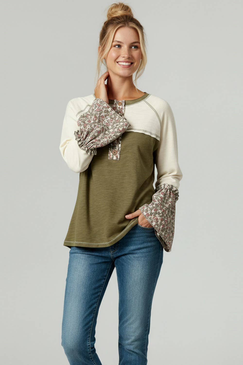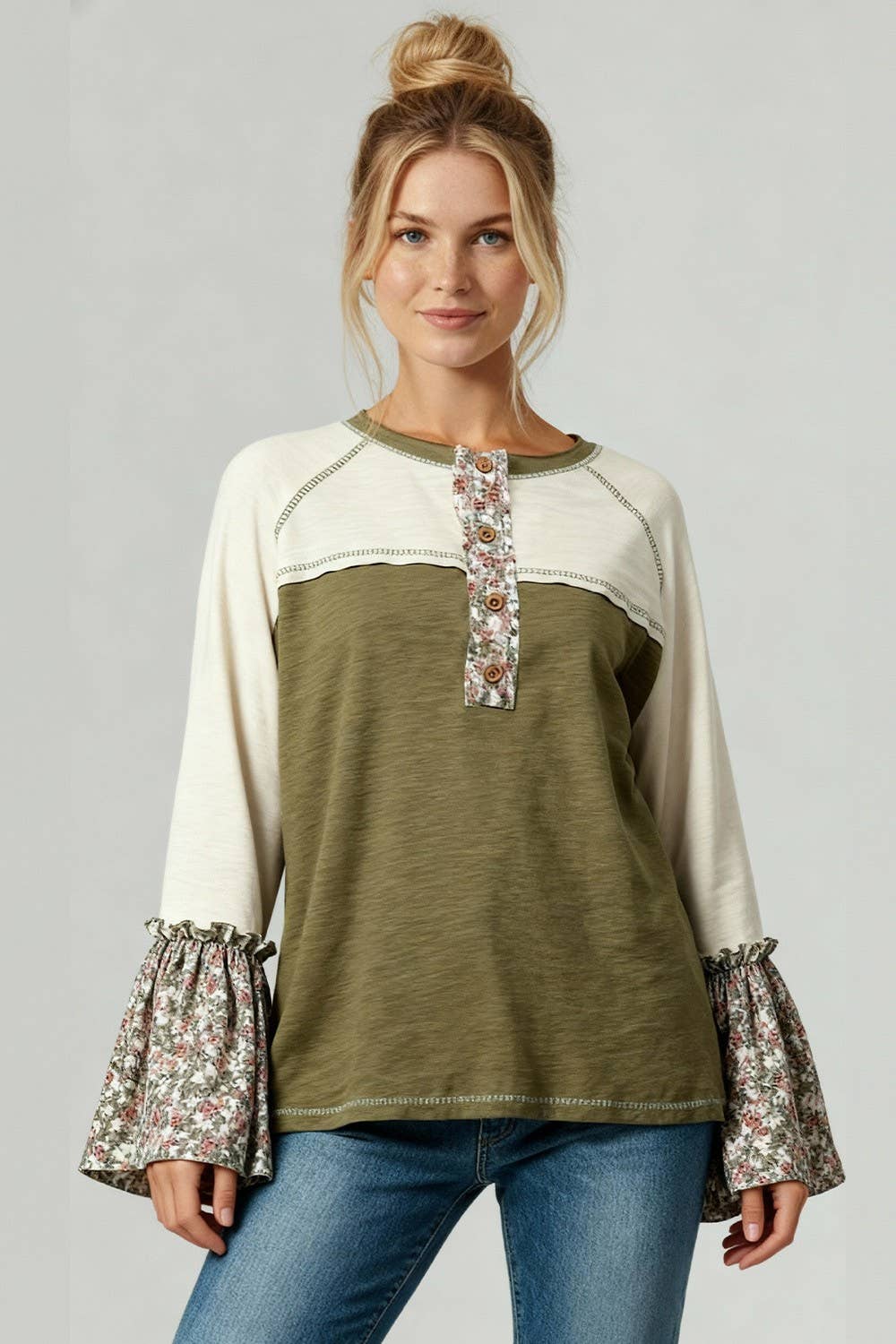 ROUND NECK RAGLAN FLORAL PRINT COLOR BLOCK YOKE AND PLACKET BUTTONED BELL BOTTOM LONG SLEEVE OVERSIZED LOOSE FIT COTTON SLUB KNIT TOP