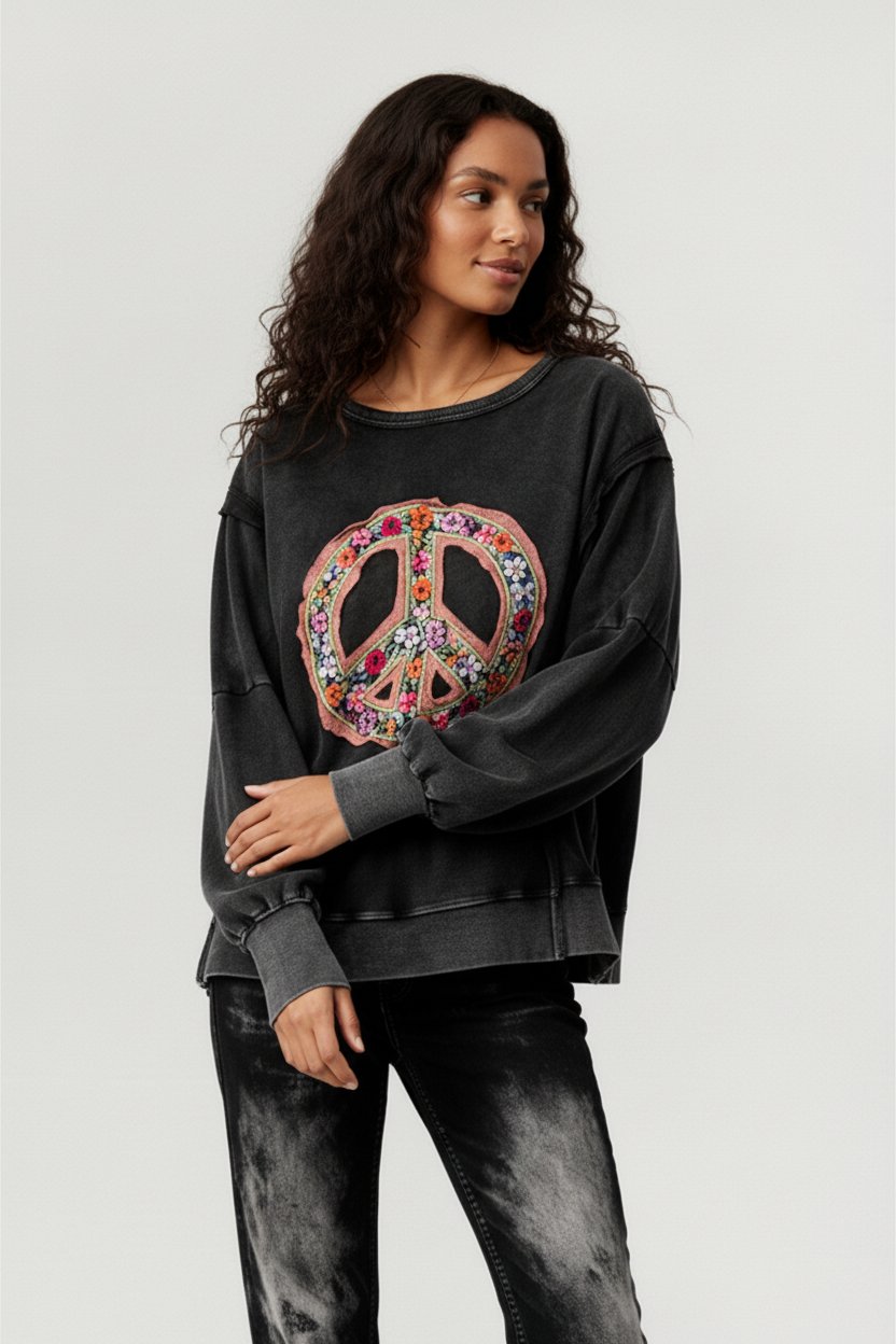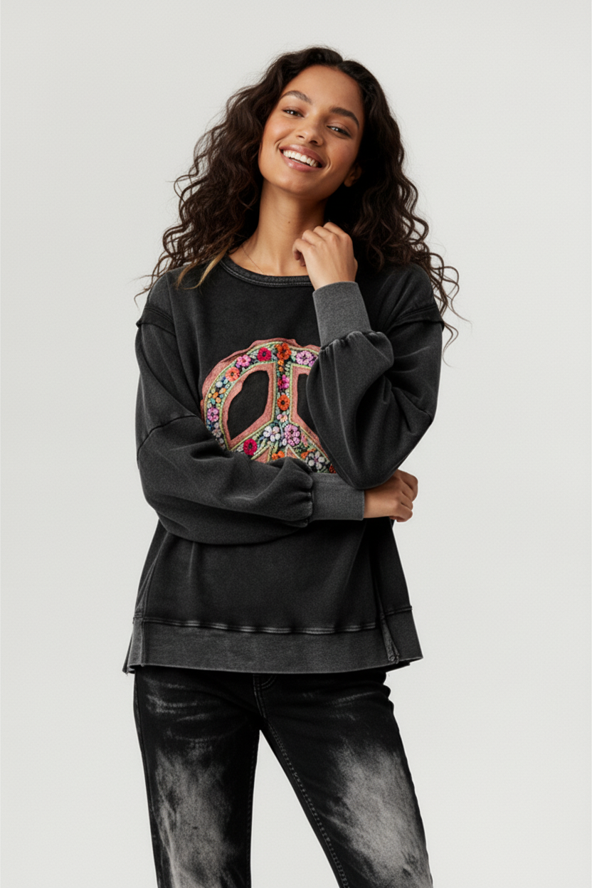 EMBROIDERED PEACE WASHED PULLOVER KNIT TOP