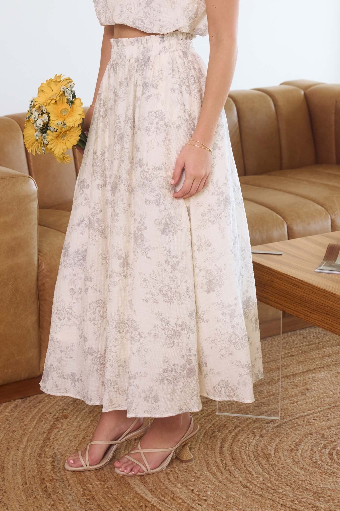 Floral Ruffle Waist Midi Skirt
