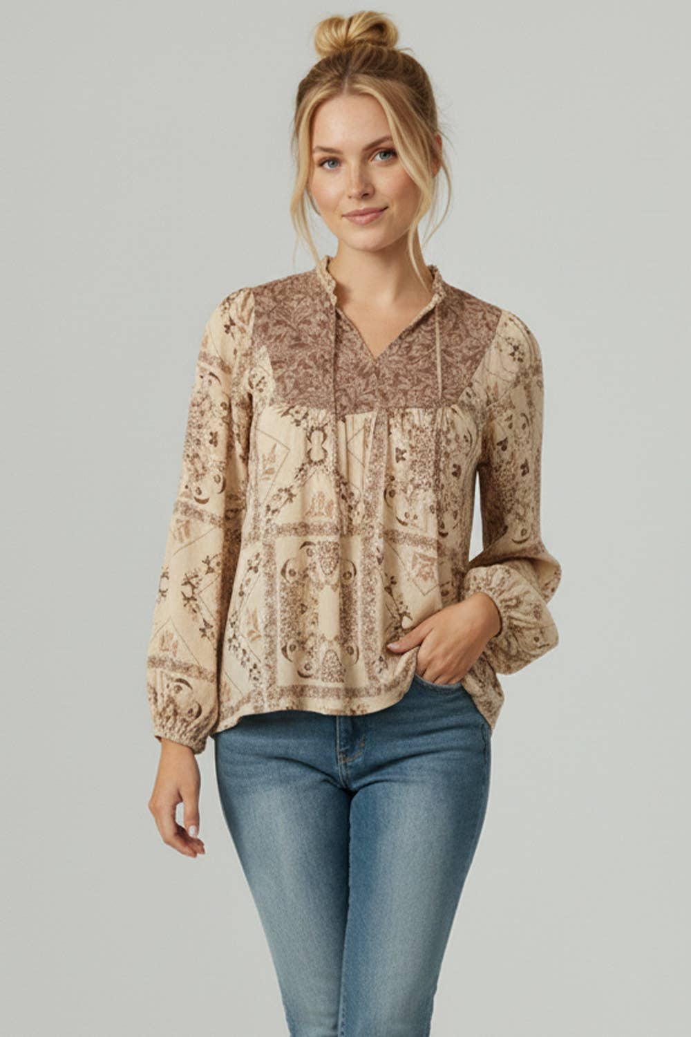 FRILLED MOCK NECK TIED BOW LONG SLEEVE FLORAL BOHEMIAN PRINT COLOR BLOCK PEASANT WOVEN BLOUSE TOP