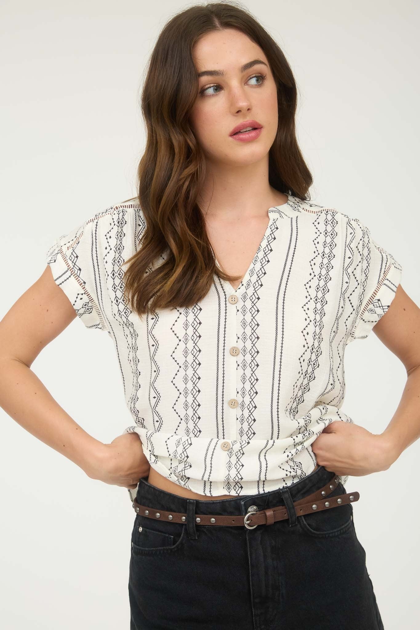 V NECKLINE SHORT SLEEVE BUTTON DOWN NOT LINED WOVEN TOP GEOMETRIC PATTERN 80% RAYON 20% NYLON EXCLUSIVE OF DECORATION