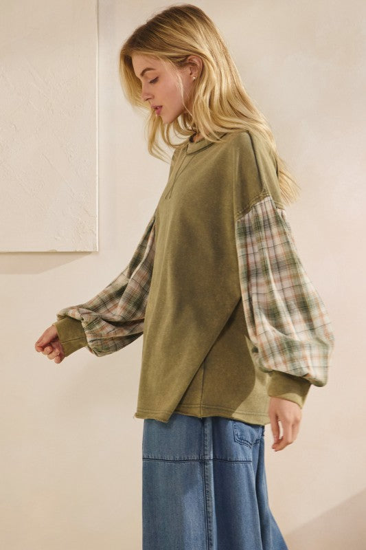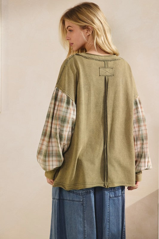 THE INDIE FLANNEL CONTRAST PULLOVER - MINERAL-WASH - PUFF PLAID SLEEVE - CONTRAST KNIT CUFFS AND NECKLINE WITH RAW-EDGE DETAILING - RELAXED OVERSIZED FIT - LIGHTWEIGHT AND BREATHABLE Features soft cotton jersey body and puffed long sleeves in a muted plaid flannel — blending comfort and charm in one boutique-ready piece. Subtle raw hem details and a relaxed silhouette give it that laid-back look, while the contrast neckline "X" stitch adds a sporty touch. 100% COTTON
