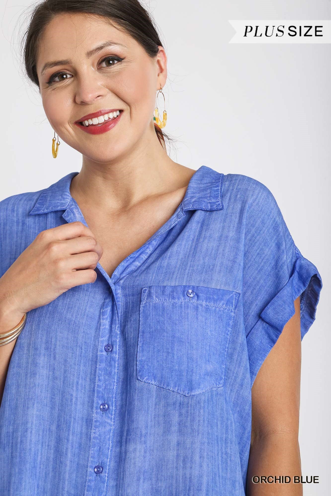 Washed Button Up Short Sleeve Top with Frayed Hemline