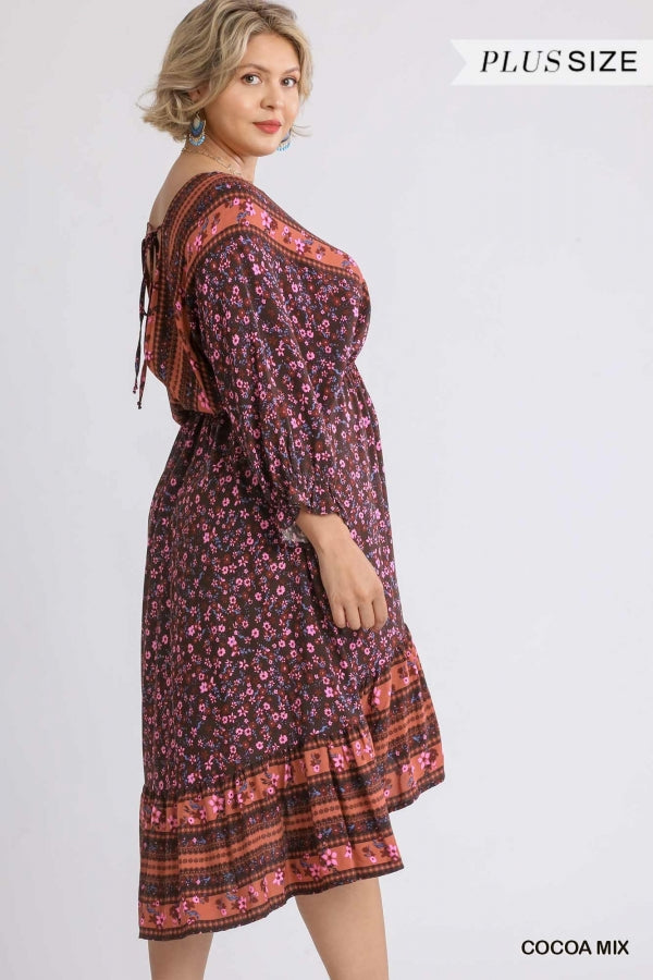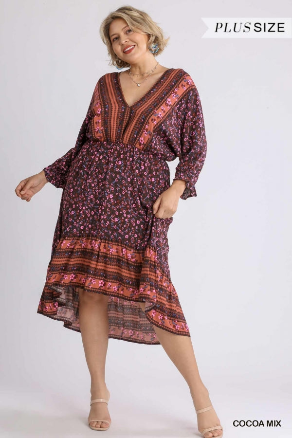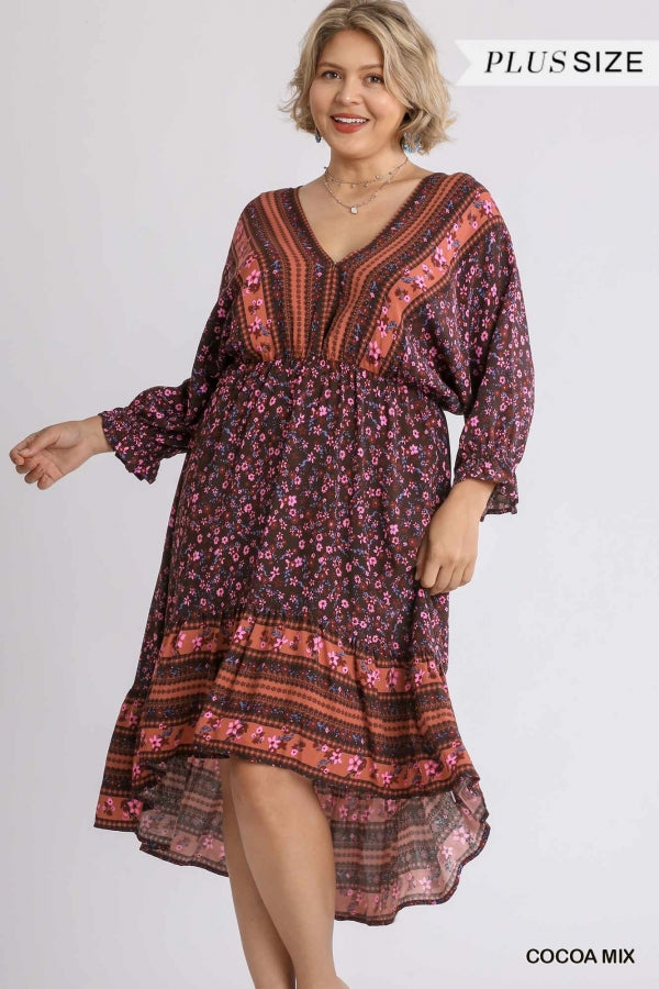 Floral Border Print V-Neck Dolman Sleeve Dress with High Low Hem and Back String Tie