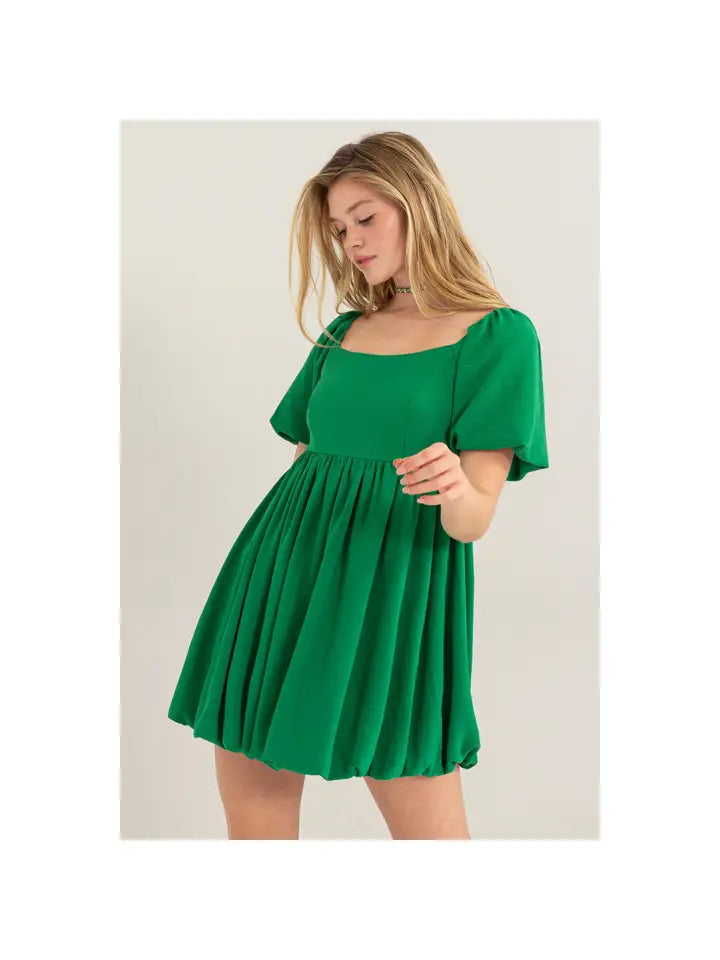 ELEVATE YOUR SPRING WARDROBE WITH THIS MINI DRESS. IT'S A MUST-HAVE WITH ITS SQUARE NECK, BREEZY SHORT SLEEVES AND A BABYDOLL BODICE THAT TOPS A GATHERED HIGH WAISTLINE AND A BUBBLE LITTLE SKIRT. OPEN BACK IS ACCENTED WITH A FLIRTY TIE DETAIL.