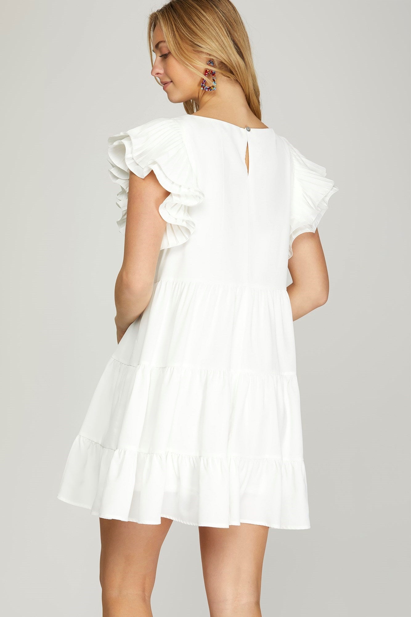 PLEATED RUFFLE SLEEVE TIERED WOVEN DRESS