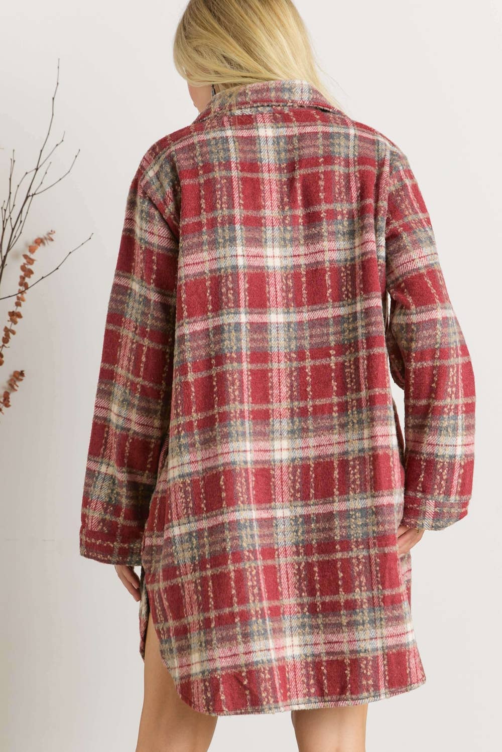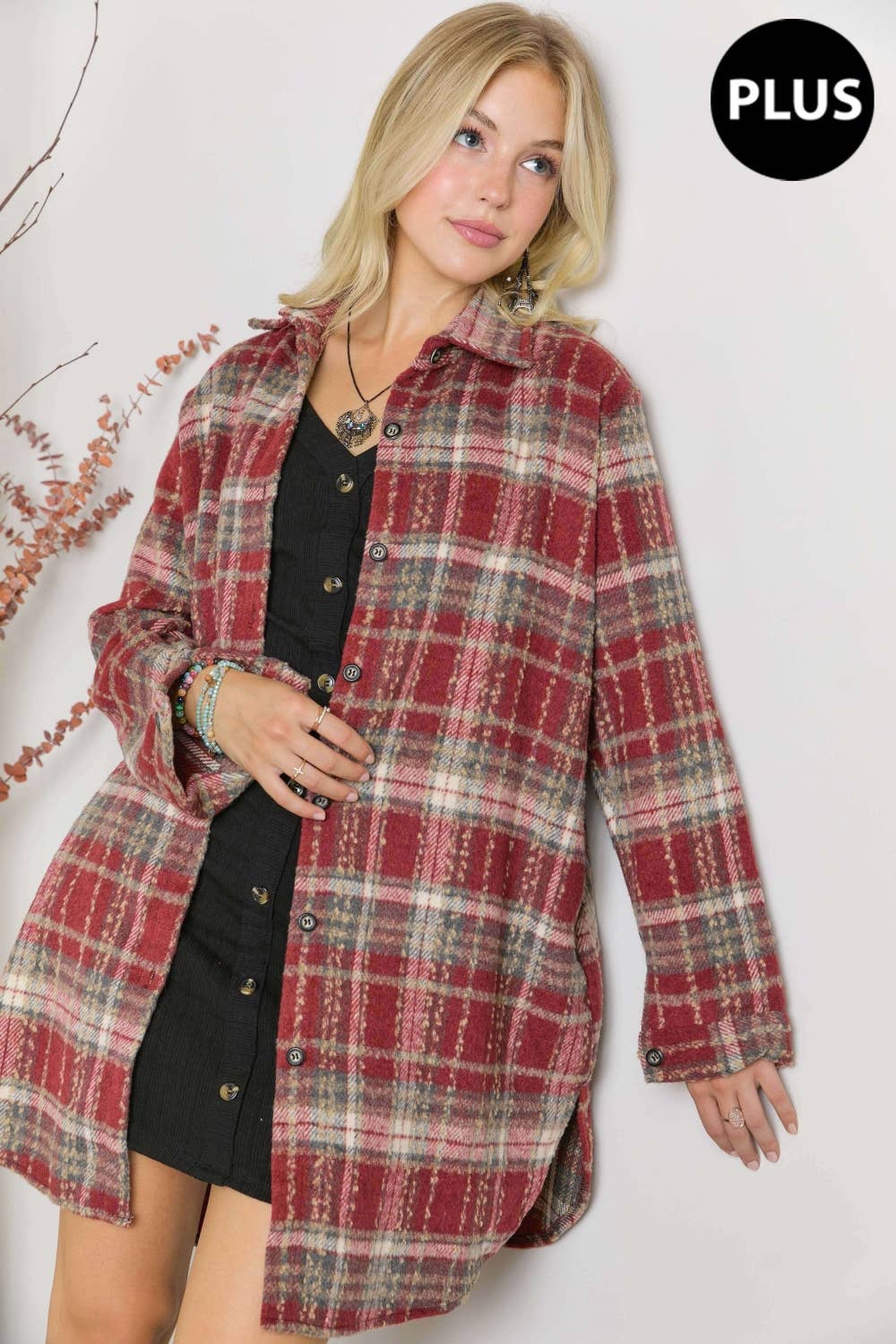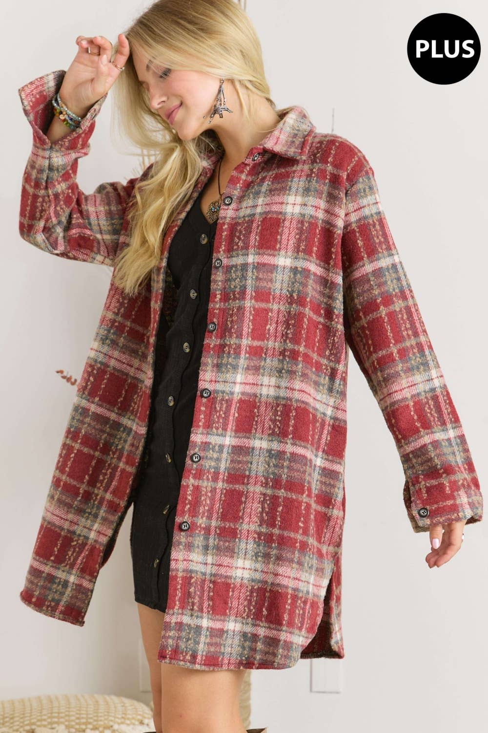 PLUS SIZE CHECK FLANNEL SHACKET W/ LONG SLEEVE 100% POLYESTER. *Plus size *Button down *Classic plaid, check *Flannel shacket *Warm, daily, casual wear Actual product color may vary from the images shown. Every monitor or mobile display has a different capability to display colors, and every individual may see these colors differently.