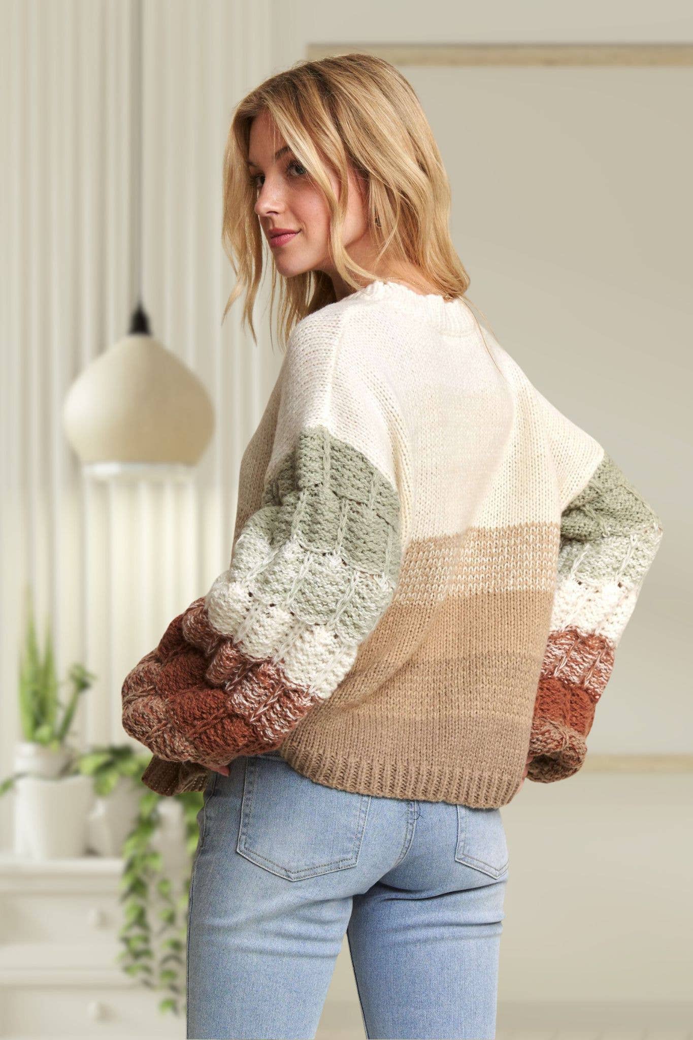 Crafted from 100% polyester, this sweater top showcases an eye-catching design with voluminous puff sleeves. The sleeves are adorned with a detailed, dimensional knit pattern that adds significant texture and visual interest. The main body of the sweater is made with a fine knit, offering a comfortable feel and a flattering drape. A key characteristic is its unique color application, which features soft, blended hues that flow seamlessly from one section to another, creating a sophisticated and modern aesthetic. 100% POLYESTER *Plus Size *Puff sleeve *Drop shoulder *Multi color *Ombre, Colorblock Actual product color may vary from the images shown. Every monitor or mobile display has a different capability to display colors, and every individual may see these colors differently.