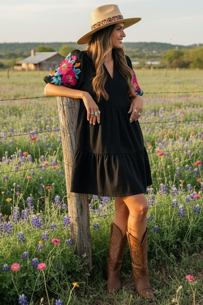 Floral embroidered baby doll dress featuring slit neckline and tiered bottom.