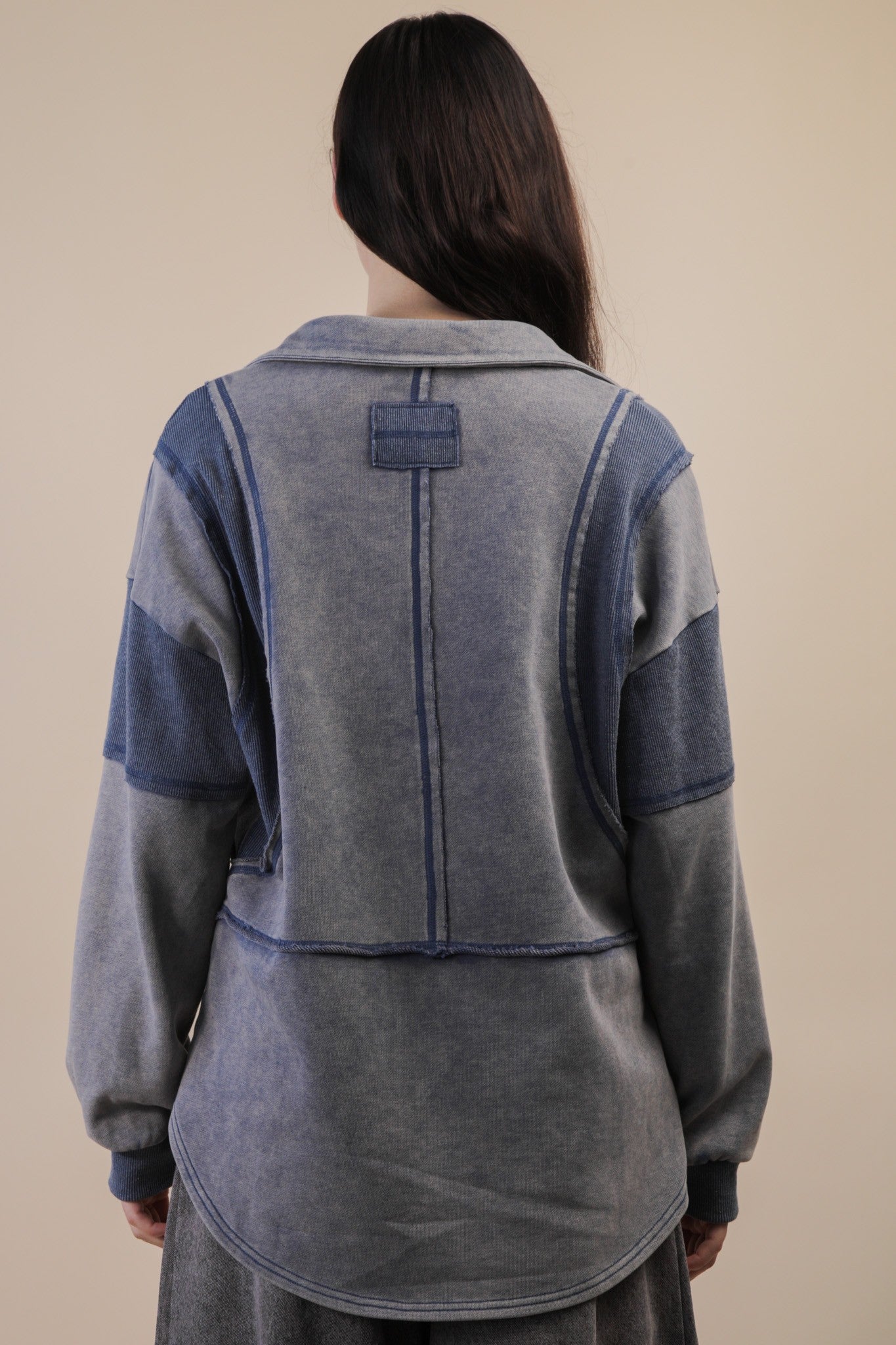 PLUS SIZE Mineral Washed French Terry Knit Top - Collared - Drop Shoulder - Long Sleeve - Round Hem CONTRAST: 62%POLYESTER 34%COTTON 4%SPANDEX