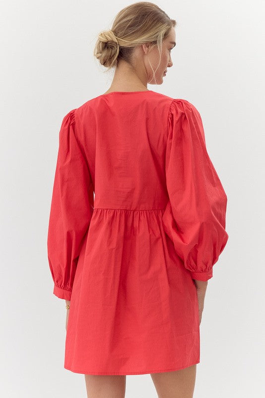 Solid baby doll dress with bow ties neckline, side pockets, long peasant