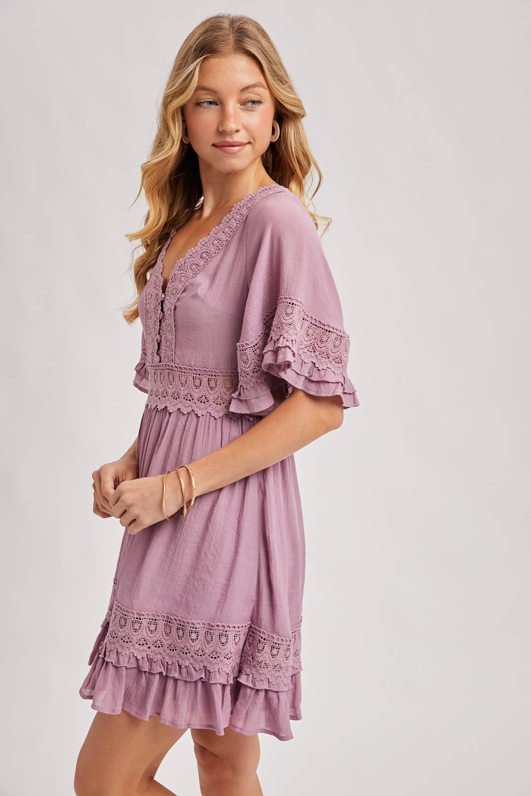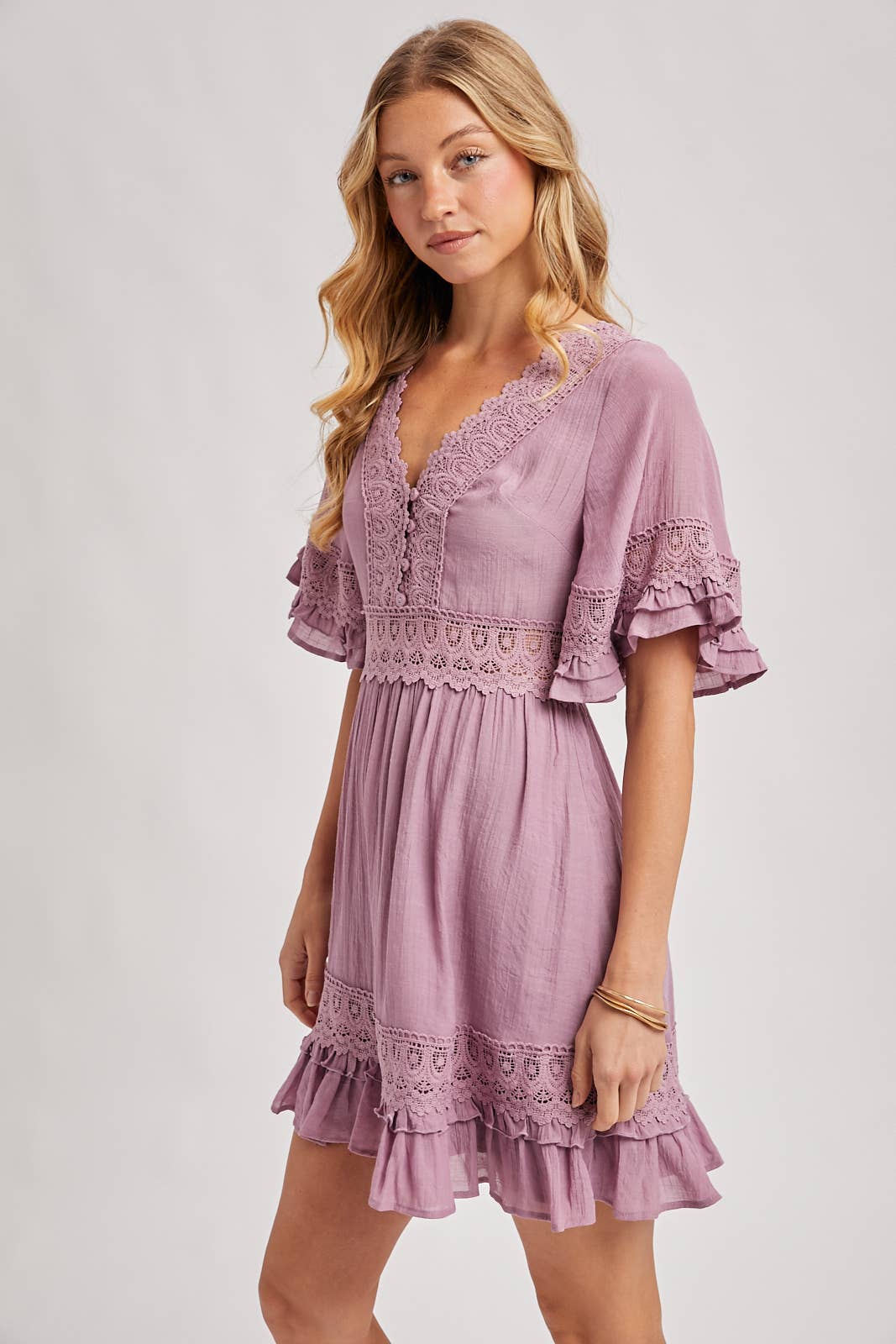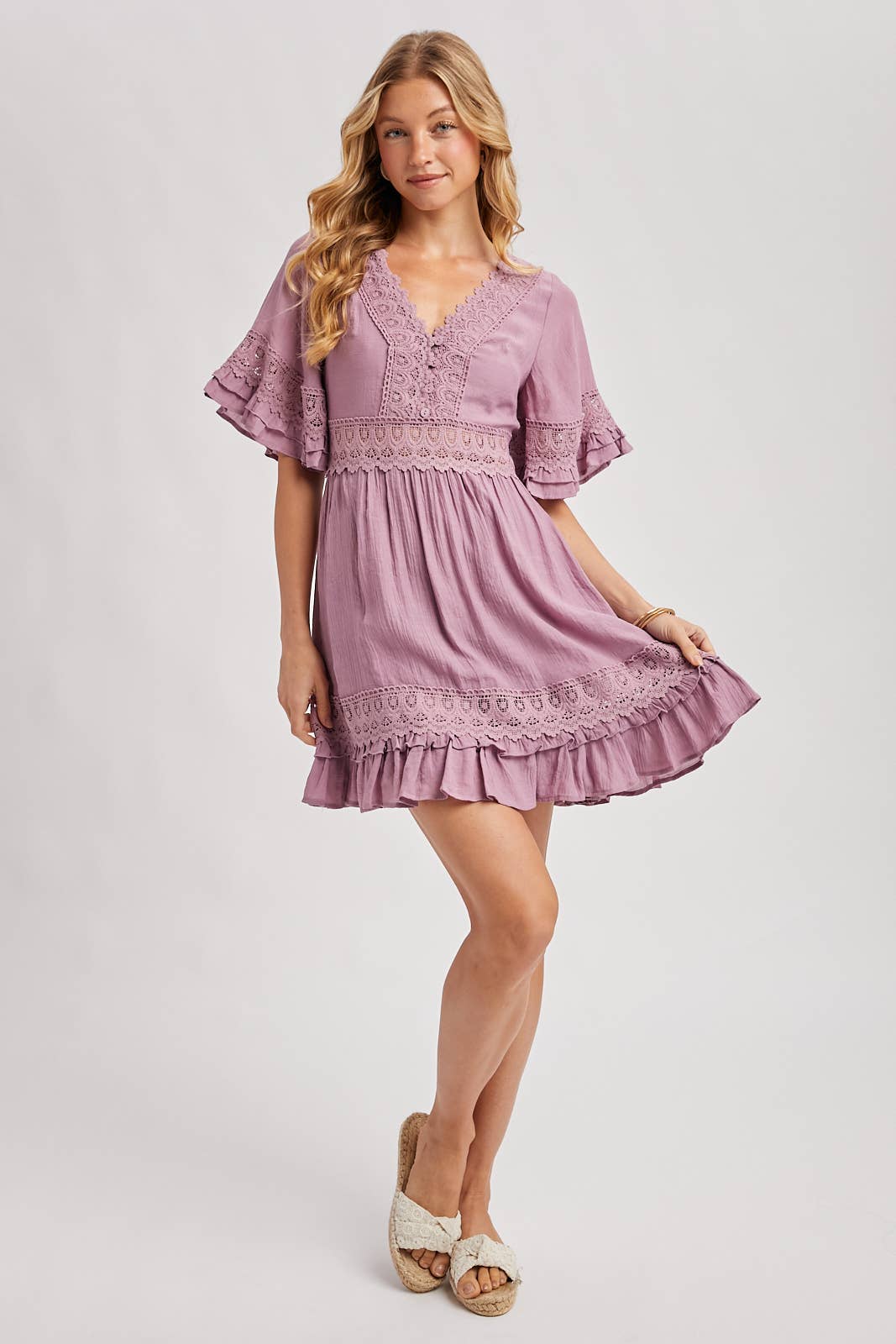 The mini dress showcases a flattering V-neckline, adding a touch of elegance to the design. The sleeves are adorned with lowy ruffle trim, creating a feminine and playful look. Delicate lace trim decorates the neckline, waist, and hem, enhancing the dress with a romantic and intricate detail. The open back features a charming tie detail, adding a hint of allure to the overall style. To ensure a seamless fit, the dress is equipped with a hidden back zipper/closure. Easter day. -Model is 5'9" and wearing a Small
