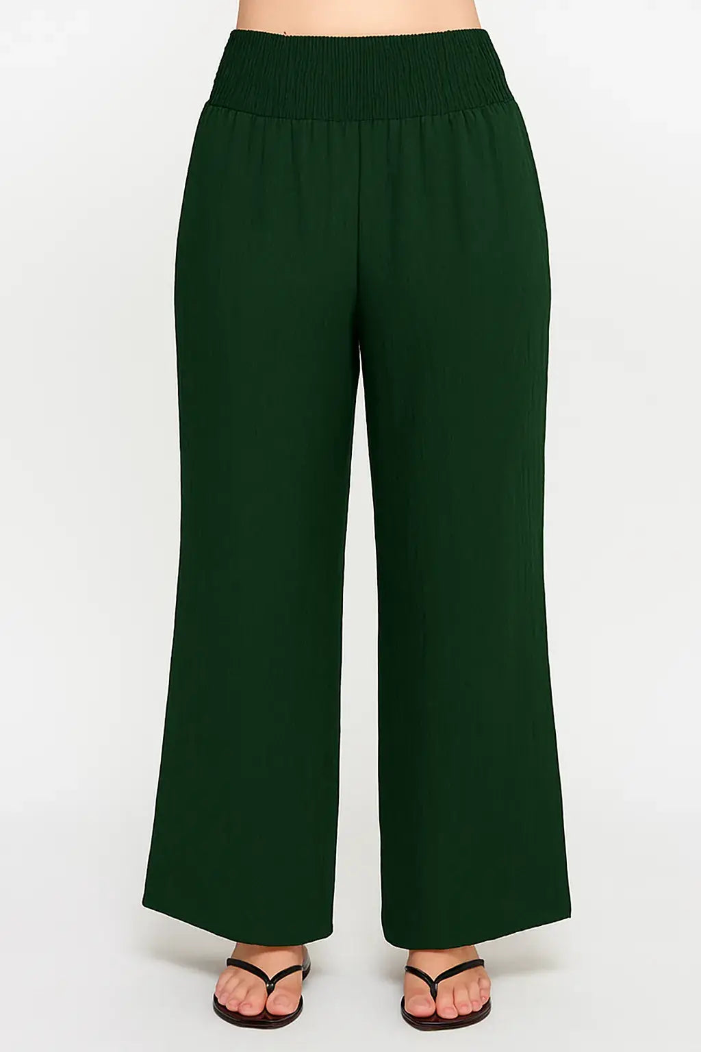 Plus size, wide leg pant with smocked waist detail, side pockets, and relaxed fit.