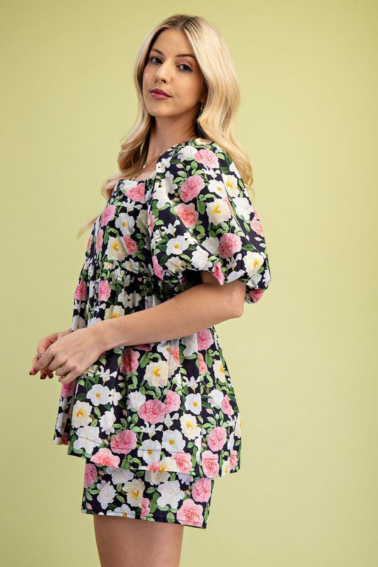 Floral Puff Sleeve Skort-Like Romper with Tie Back and Zipper Closure Model is 5'7" wearing a small.