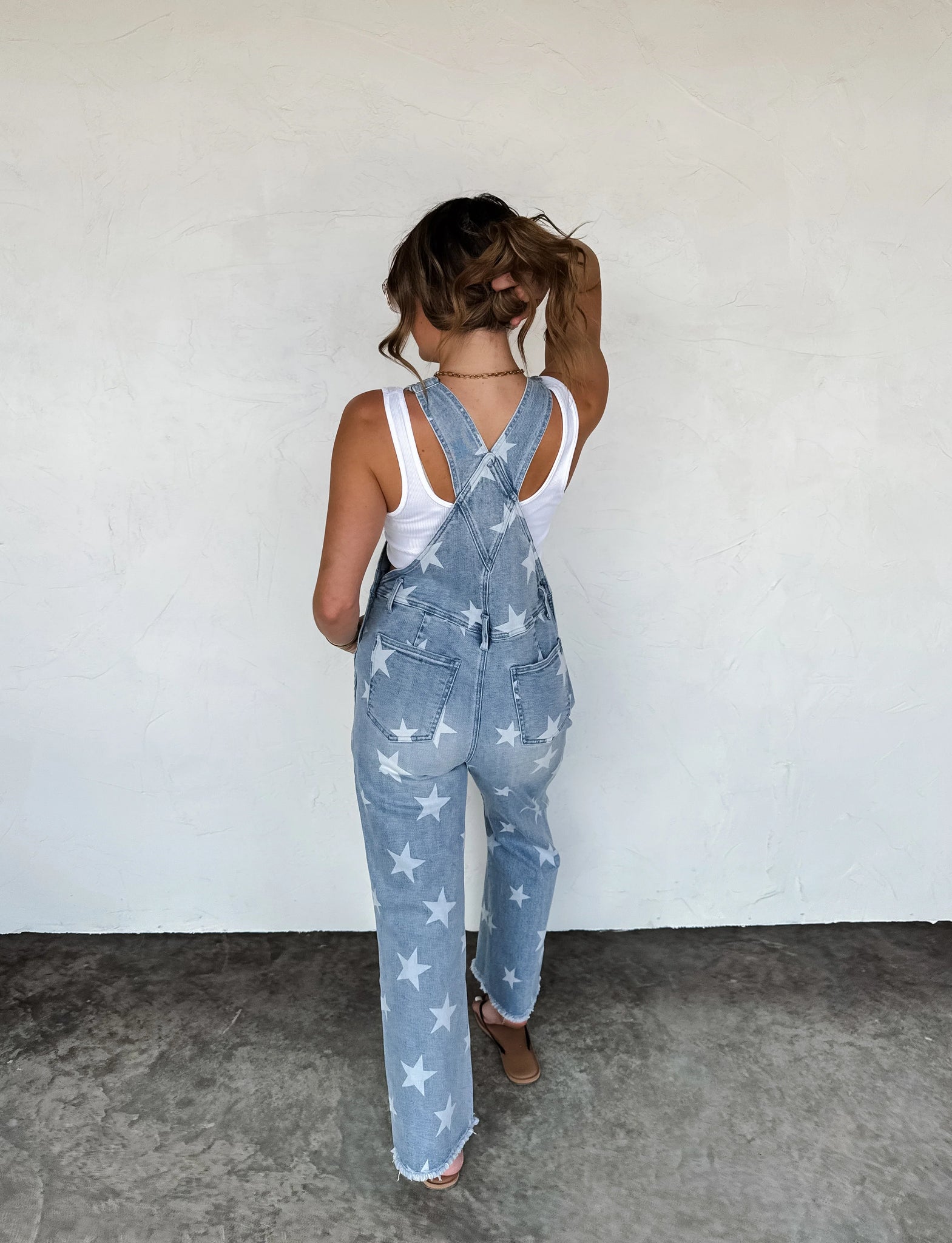 Now available in our stunning LIGHT WASH denim fabric with bleached star designs! Such a flattering fit and all-day comfort! Features a front bib pocket, adjustable straps, back pockets, belt loops and a raw hem. Cut the hem to your preferred length or roll them up for a cropped look