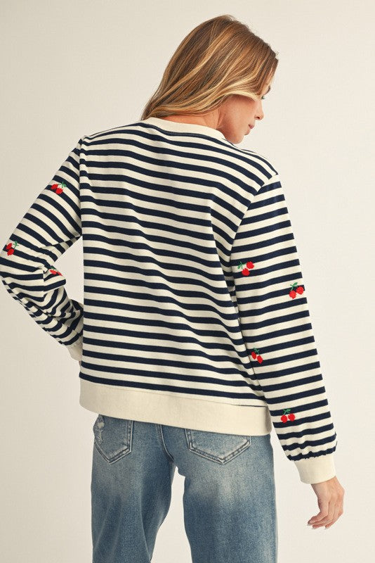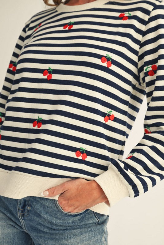 Long sleeves casual stripe top with cherry embroidery. - Model is 5'8'' and is wearing a Small.