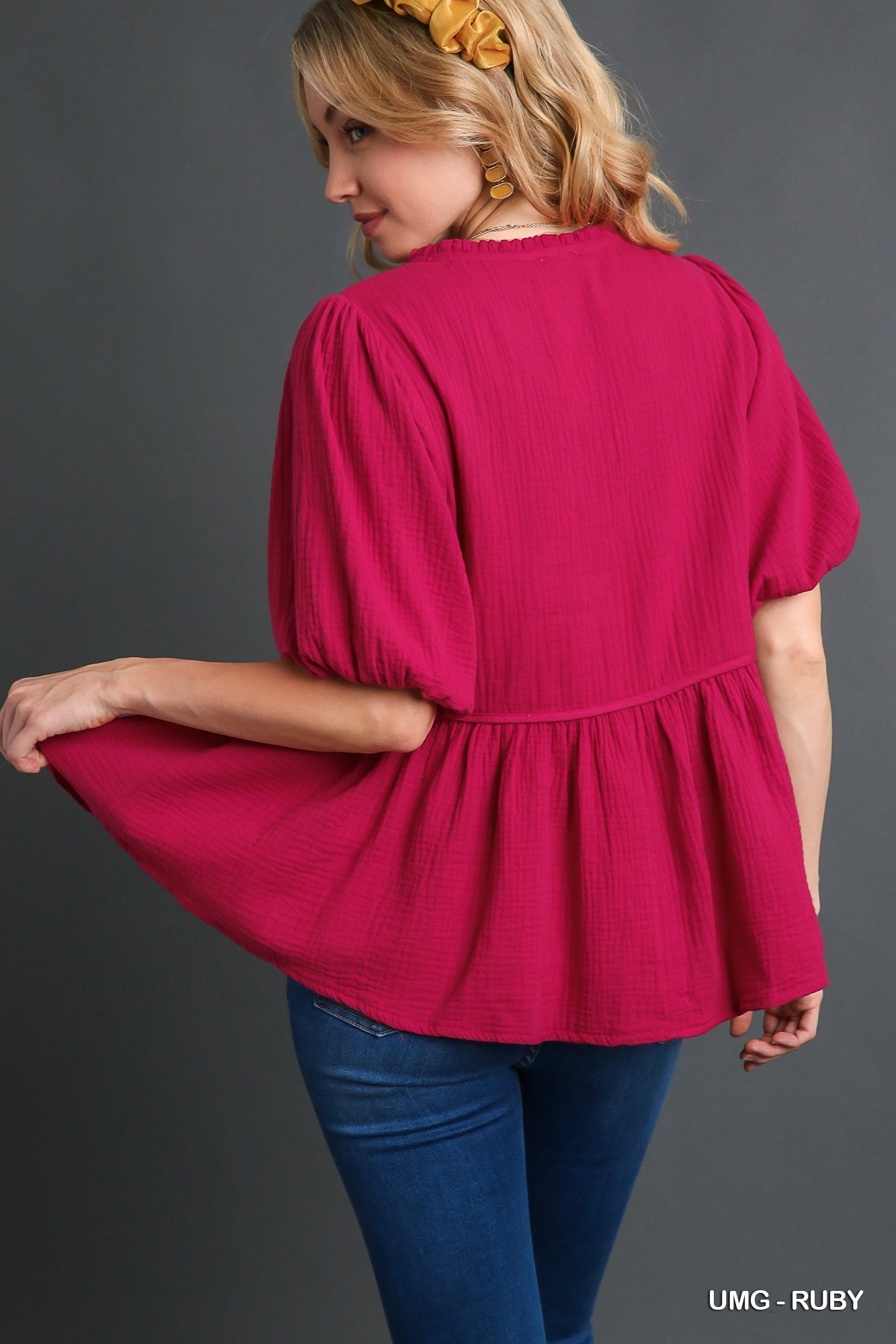 Cotton Gauze Floral Embroidery BabyDoll Top, 3/4 Long Sleeve & Drawstring Detail