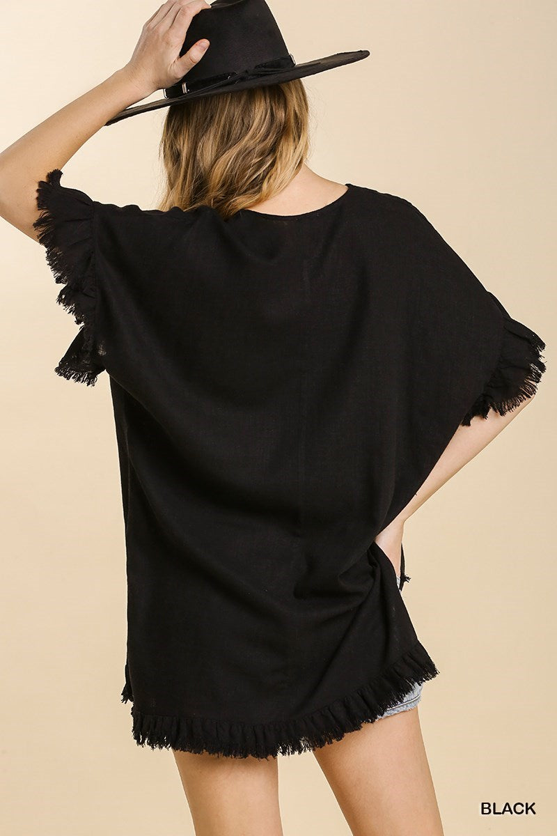 Linen Blend V-Neck Ruffle Sleeve Tunic Top with High Low Frayed Ruffle Hem & Side Slits